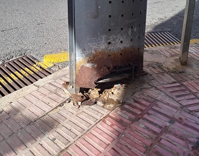 Pongo el foco, de forma específica, en la papelera situada en la esquina de Vía Roma con Fra Juniper Serra. Esta estructura está completamente agujereada en su base y se suma a la suciedad diaria de una acera que también requiere una intervención urgente.