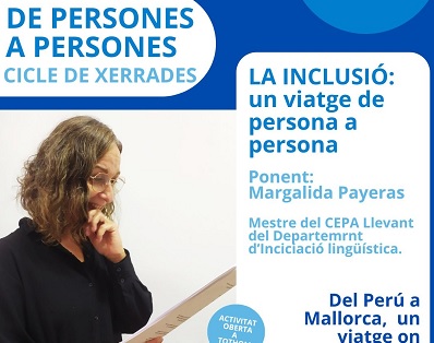 CEPA Llevant de Manacor charlas del programa DE PERSONES A PERSONES ¡Comenzamos nuestro ciclo de charlas DE PERSONAS A PERSONAS!. La inclusión será el tema que tratará la ponente y maestra del CEPA Margalida Payeras.